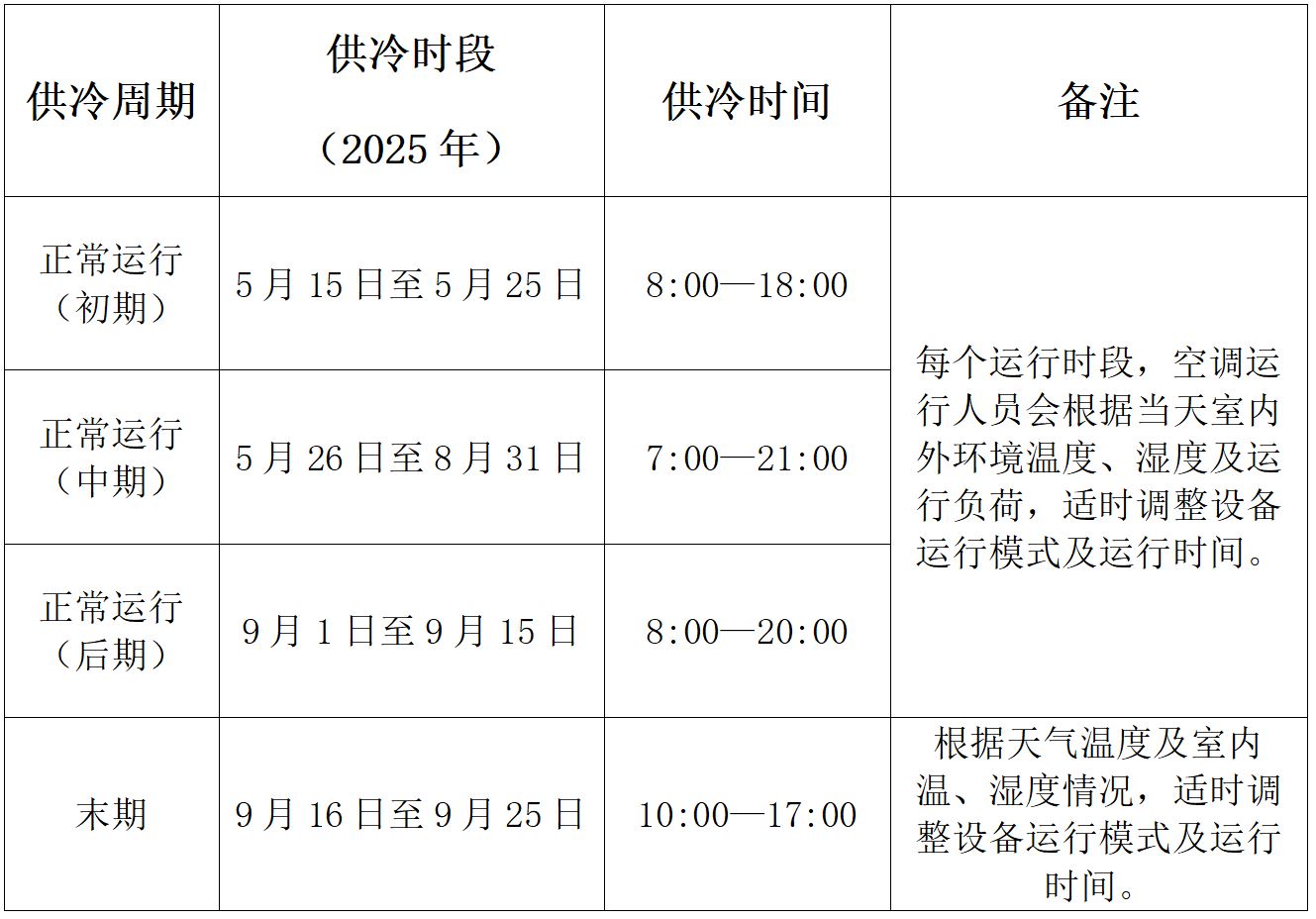 此前,总务部结合不同楼宇的具体情况,已在部分区域启动供冷试运行,在夏季供冷期间,我们将根据天气变化,动态调整供冷方案。2025年夏季空调系统供冷安排如下: