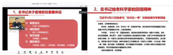 随后,由规资处副处长陈辉同志带领全体党员进行政治学习,集中学习了习近平总书记在5月6日召开的中共中央政治局常务委员会上关于疫情防控的重要讲话以及习近平总书记给参与“东方红一号”任务的老科学家回信精神,学习老科学家“敢于战胜一切艰难险阻、勇于攀登航天科技高峰”的精神。