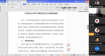 政治学习部分,首先由规资处党支部纪律委员赵晖带领大家集中学习《党委(党组)落实全面从严治党主体责任规定》和工信部党风廉政建设领导小组办公室关于部属单位某领导干部违反公务用车制度规定等有关问题的通报,通过警示教育,深化以案为鉴、以案促改。紧接着,由童兴老师与大家共同学习了《中共工业和信息化部党组2020年全面从严治党工作要点》。