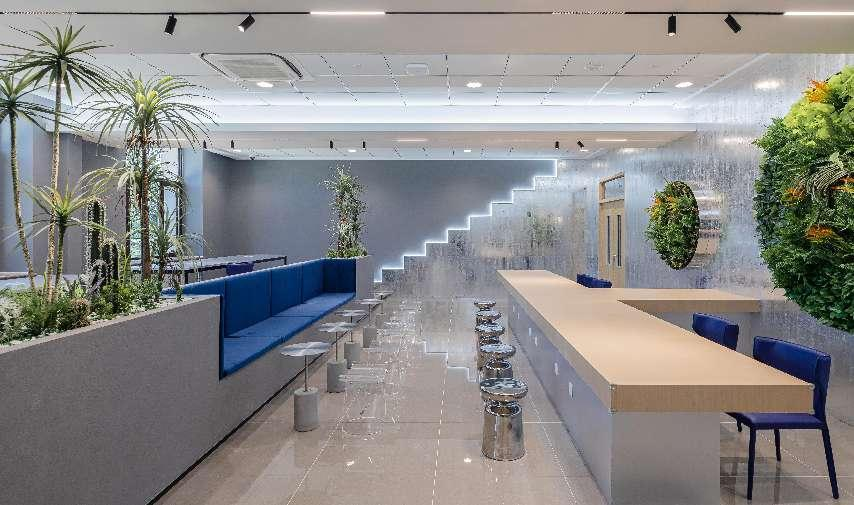 五层主要设置共享休闲区及展厅。共享休闲区采用轻松明亮的设计风格,橘色、蓝色的色调点缀增添了轻松的休憩感,室内绿植元素带来多样化的微气候感受,配以具有现代化设计风格的家具,在满足功能性的同时进一步提高了空间的整体品质,未来将会成为师生休闲、研讨的新地标。
