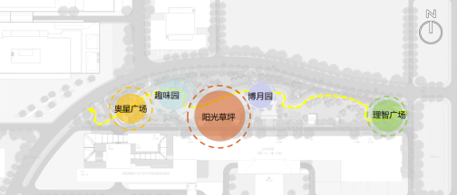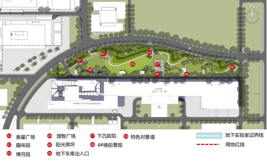 2. 在场地内修建贯通东西方向的休闲漫步步道,串联起4个休闲节点,同时结合建筑出入口设置南北向的步道,将主楼地库景观打造成沙河校区西北区域的交通枢纽。未来随着西北学生生活区的启用,这里将成为校内一处新的人流汇集地,而“奥星广场”、“趣味园”、“博月园”、“理智广场”这四个休闲广场,也将为师生提供更多的户外交流空间,成为师生们课余休闲的好去处;