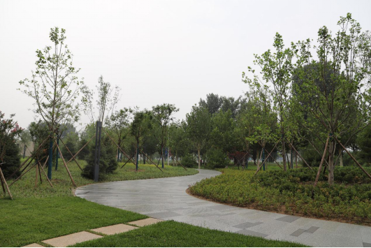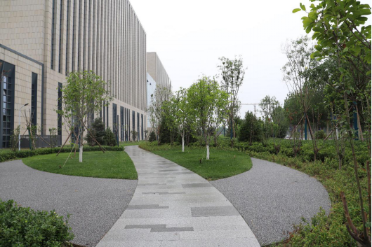 3. 地库景观南侧与主楼建筑之间有一条车行道,为车辆驶出车库的必经之路,为了确保师生步行安全,在景观南侧修建了人行步道,并以白蜡作为行道树,这条路与校内步行系统连接,使得师生出行安全更有保障。