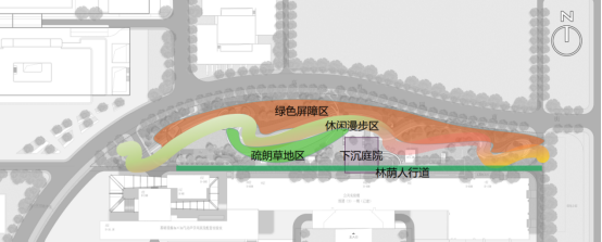 综合分析以上因素,我们结合场地现状条件、师生使用需求构建主楼地库景观的设计策略,对场地进行功能分区,由北至南,划分为“绿色屏障区”、“休闲漫步区”、“疏朗草地区”和“林荫人行道”四部分: