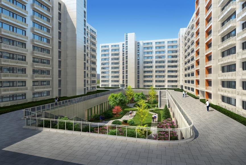 地下一层、地下二层可使用房间套内面积1.8万平米,包括大学生创新中心、师生服务大厅以及超市、理发店、健身房等配套功能用房,通过下沉庭院、采光窗井等建筑设计,采光房间面积占比超过98%,宿舍、食堂地下空间全部连通,形成宽敞、明亮、舒适的学习生活一体化空间。宿舍区域地下一层建有4个下沉景观庭院,总面积近4000平米,分别选用不同的主题种植,周边环形檐廊南北通长180米,打造温馨、宜居、学习氛围的休闲活动空间。地下二层人防区域可提供411个停车位。