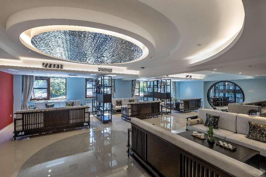 室内空间功能设置展厅、茶室、活动室、会议室、办公区等。同时将原建筑第五、六层打通,打造成视觉最佳的空中大堂,作为开放型活动空间,可俯瞰校园美景。